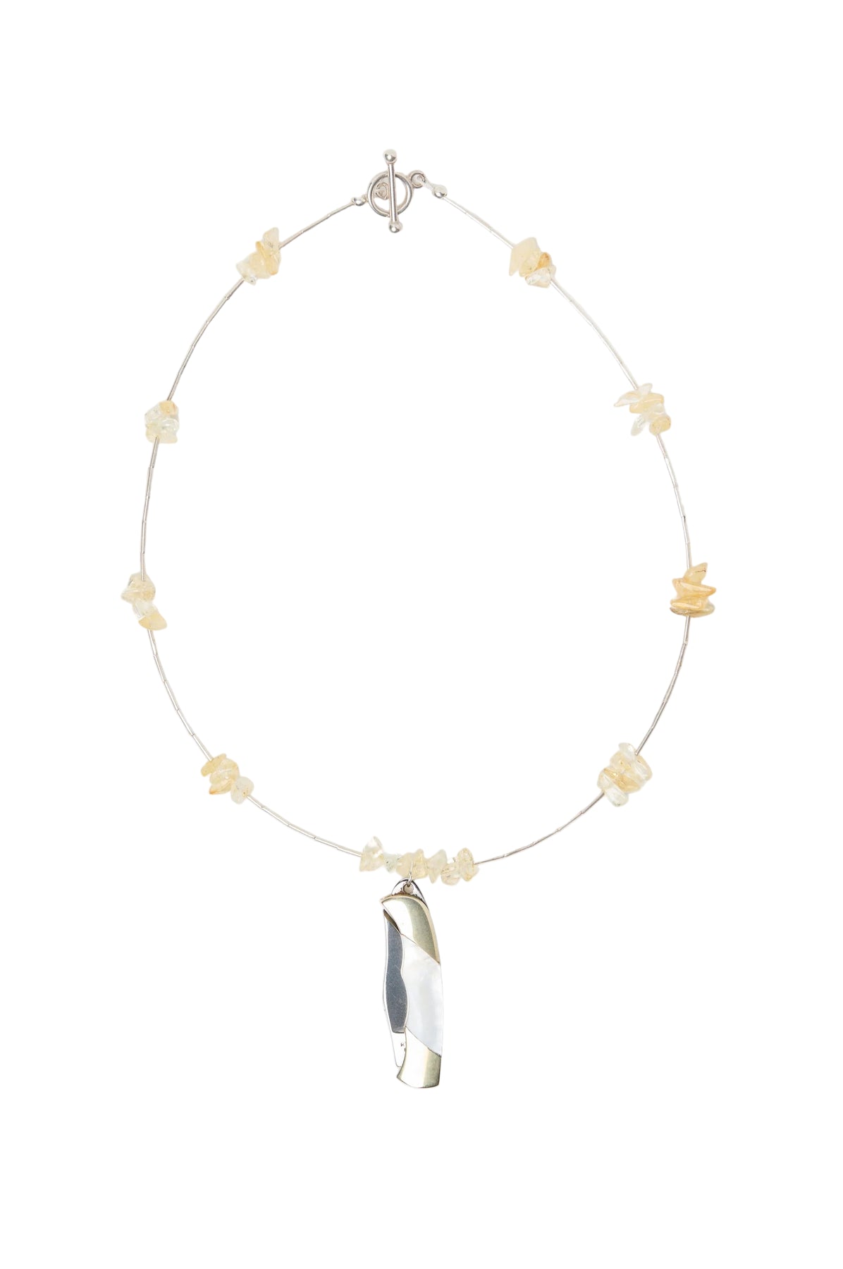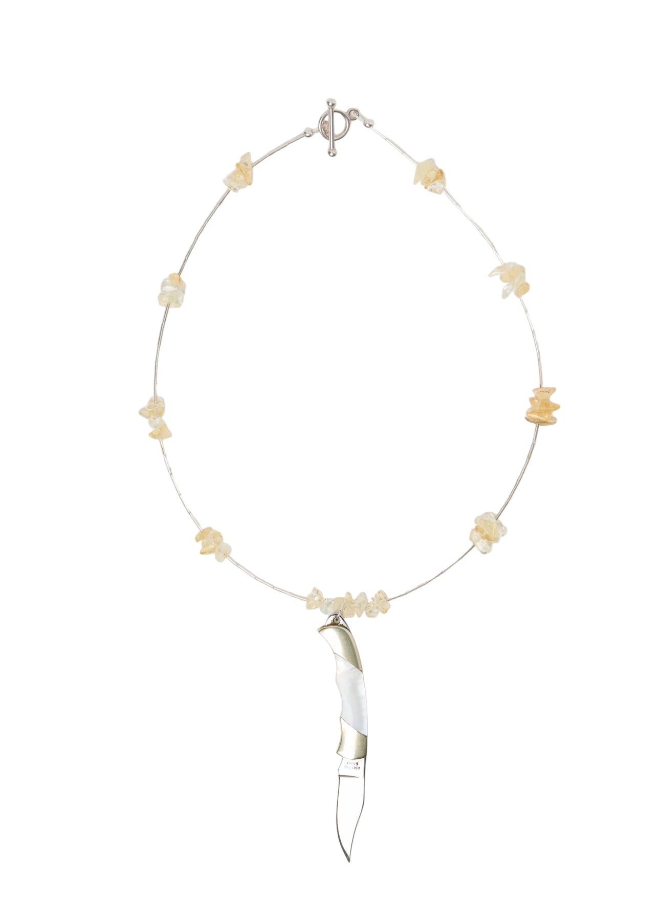 The Rider Necklace is a striking testament to Zycloom’s sculptural jewelry ethos. Handcrafted in New York City by designer Jade Boulton, this piece features baby citrine stone, sterling silver beads, and a pearl inlaid knife accent — blending raw elegance with architectural form.