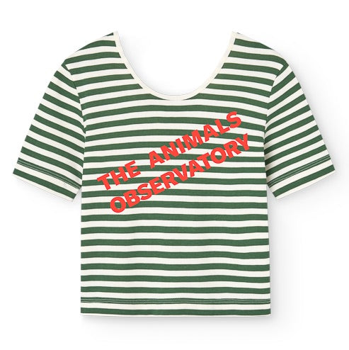 The Hippo Kid Top in Dark Garden by The Animals Observatory is a graphic everyday tee with unmistakable character. Designed in soft cotton, it features classic green-and-white stripes accented with bold logo lettering across the front.
