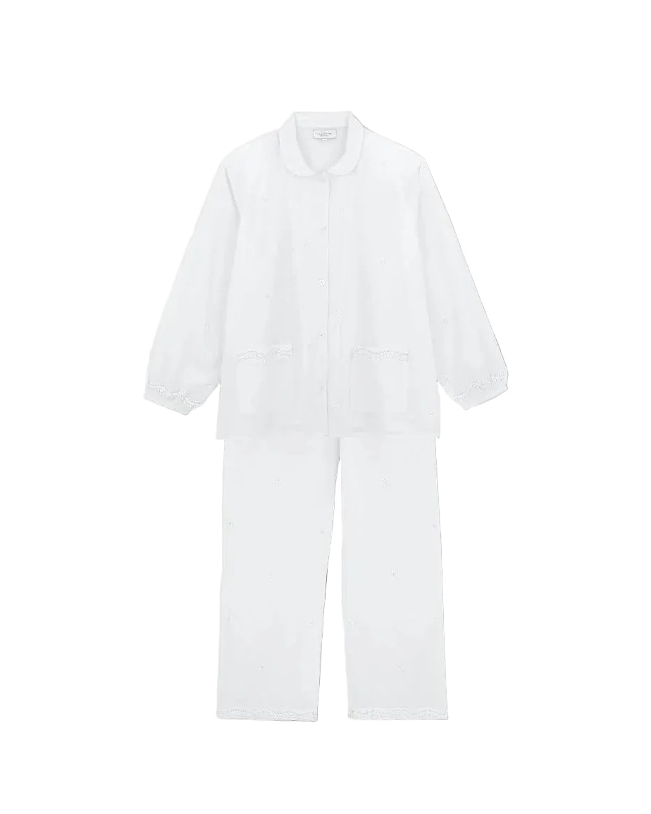 The Claudine Pyjama Set White Embroideries by Scarlette Ateliers is a timeless sleepwear essential with subtle, thoughtful detail. Crafted from soft white cotton, the set feels lightweight, breathable, and easy against the skin.