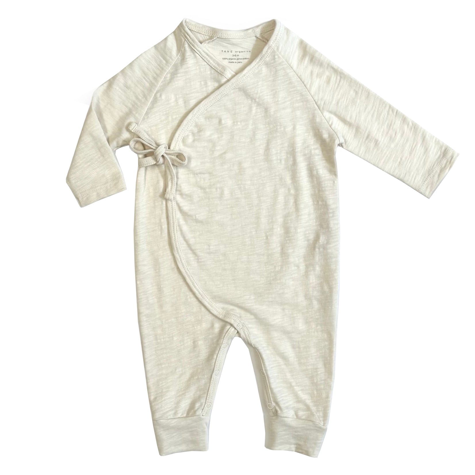 Introducing Flamé knit. Buttery soft and airy to the touch, this beautifully textured fabric was inspired by the wisp of bee’s wings. This classic silhouette is a signature of TANE organics. Inspired by the timeless shape of the kimono, this coverall has double front ties and the extra length for full pants coverage. This iconic style continues to be cherished, to be loved, and to be remembered. 100% certified organic cotton