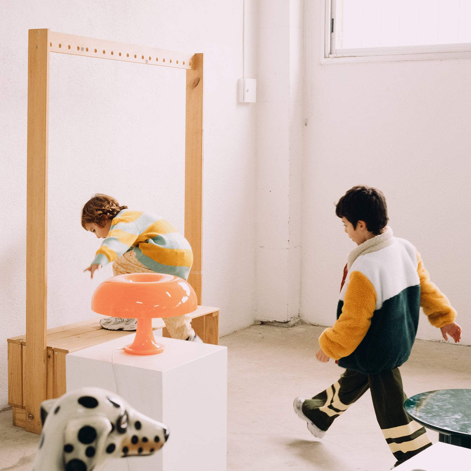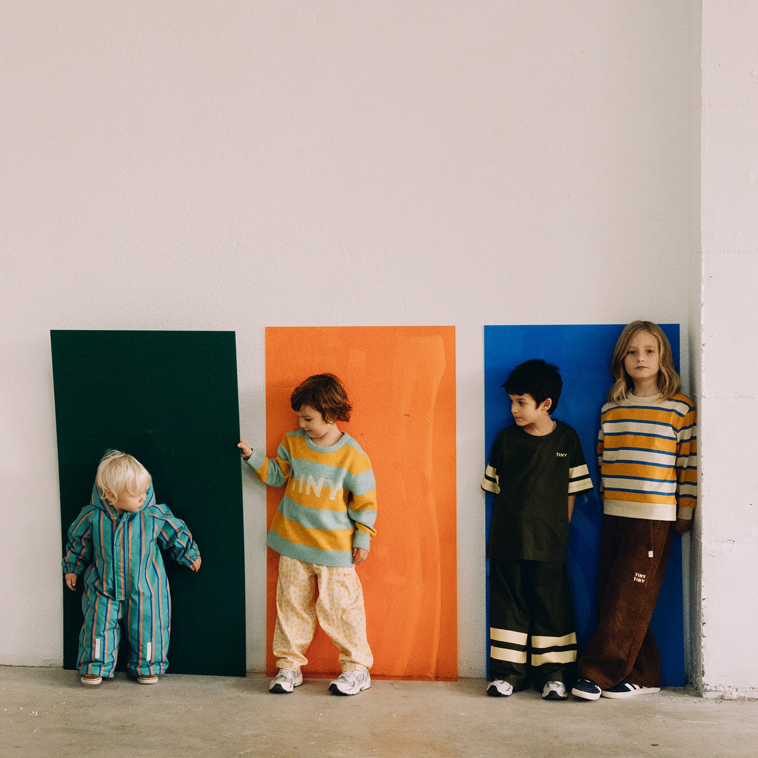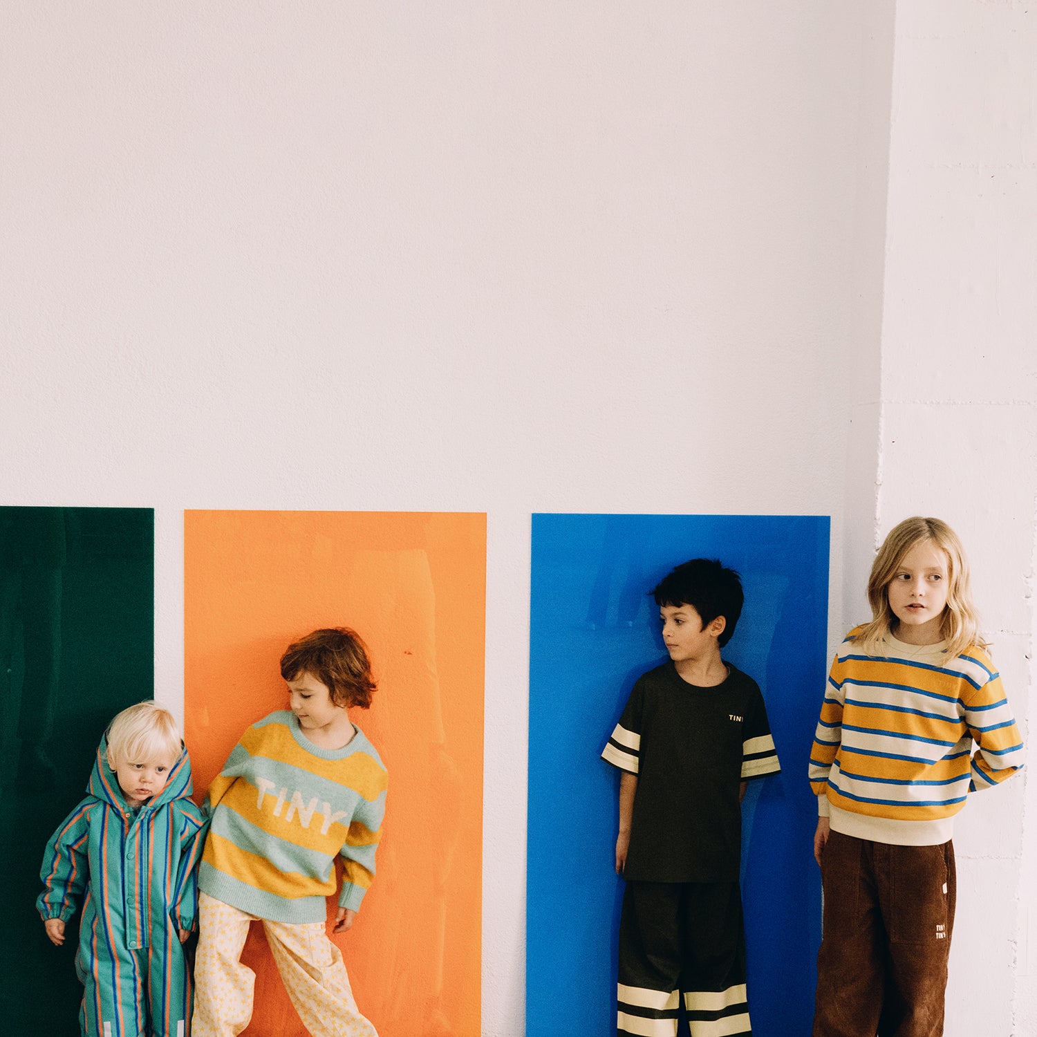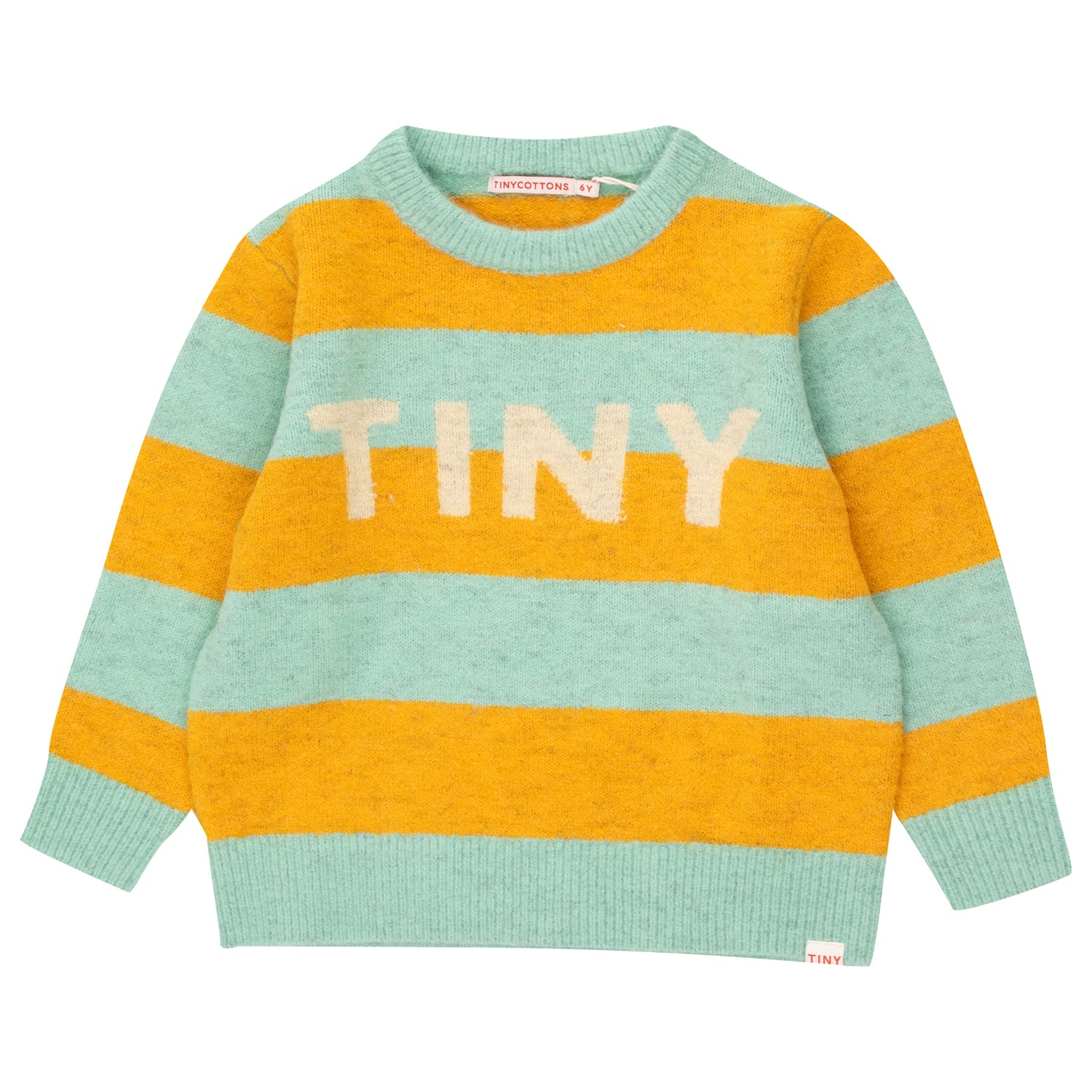 This soft fluffy sweater features bold yellow and emerald stripes and our TINY logo. With a round neckline and relaxed fit, perfect for winter days.