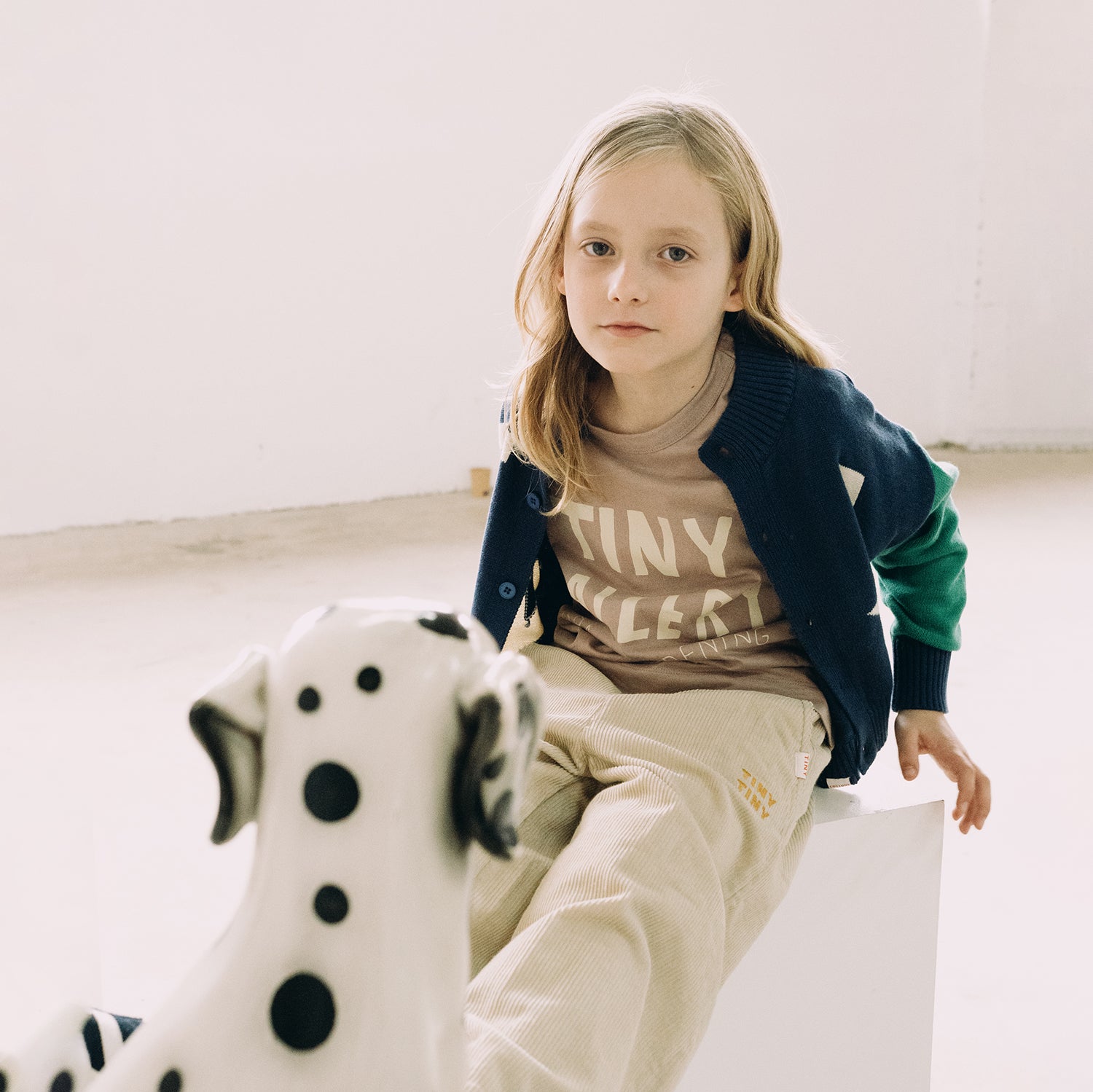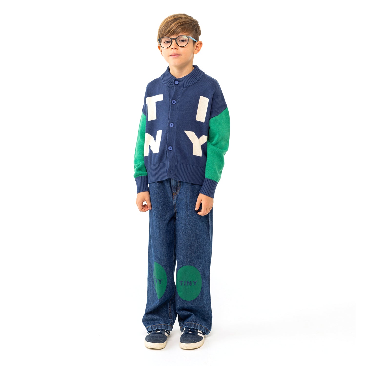 This navy cardigan with contrast sleeves is made from an 80% cotton 20% wool blend. Featuring our bold TINY logo, this cardigan has a high neck and button front with rib trims, perfect for layering on winter days.