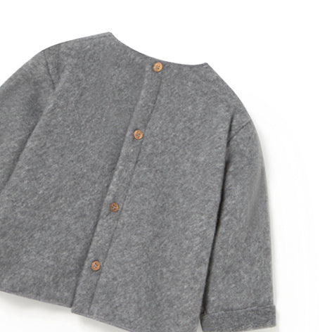 Crafted from tender bamboo fabric with a soft mélange effect, this set is designed with comfort and ease in mind. The long-sleeve top features a back button closure for simple dressing and a small front pocket for a subtle detail. The matching pants come with an elastic waistband and decorative drawstring, side patch pockets, and rolled hems. Naturally soft and flexible, it’s an everyday set little ones can move and play in with ease.