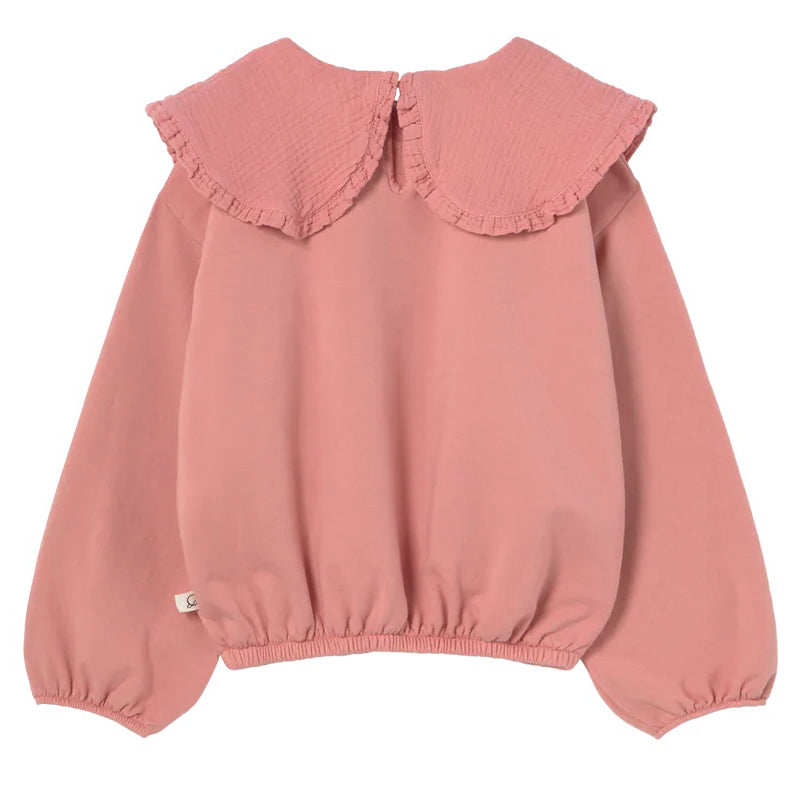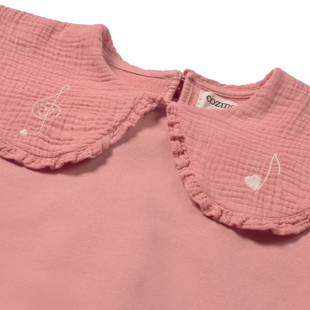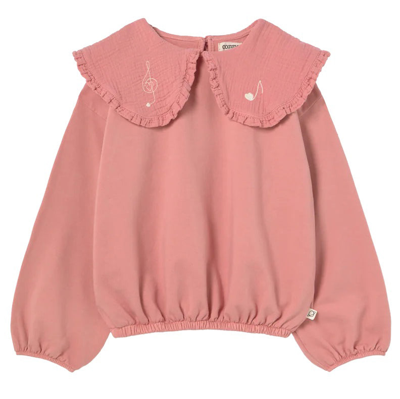 Made from premium brushed GOTS-certified organic cotton fleece, this sweatshirt features an oversized Peter Pan collar in solid rose, accented with delicate ruffle trim and small embroidered music notes. Designed with puffed long sleeves, elasticized cuffs, and an elastic hem for a soft, gathered fit. Cozy and charming with a playful finish.