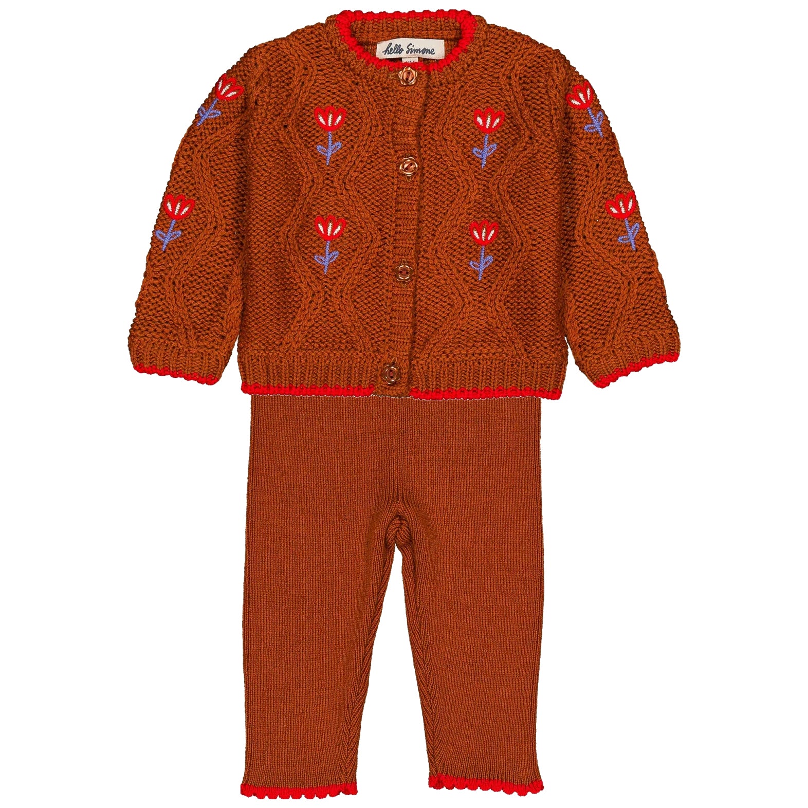 The Jeanette Cable Knit Baby Set in Hazelnut by Hello Simone is a classic two-piece crafted for comfort and charm. Made from a soft wool blend, this matching cardigan and bloomer set features delicate cable-knit detailing, scalloped edges, and tonal buttons — blending warmth with understated elegance.