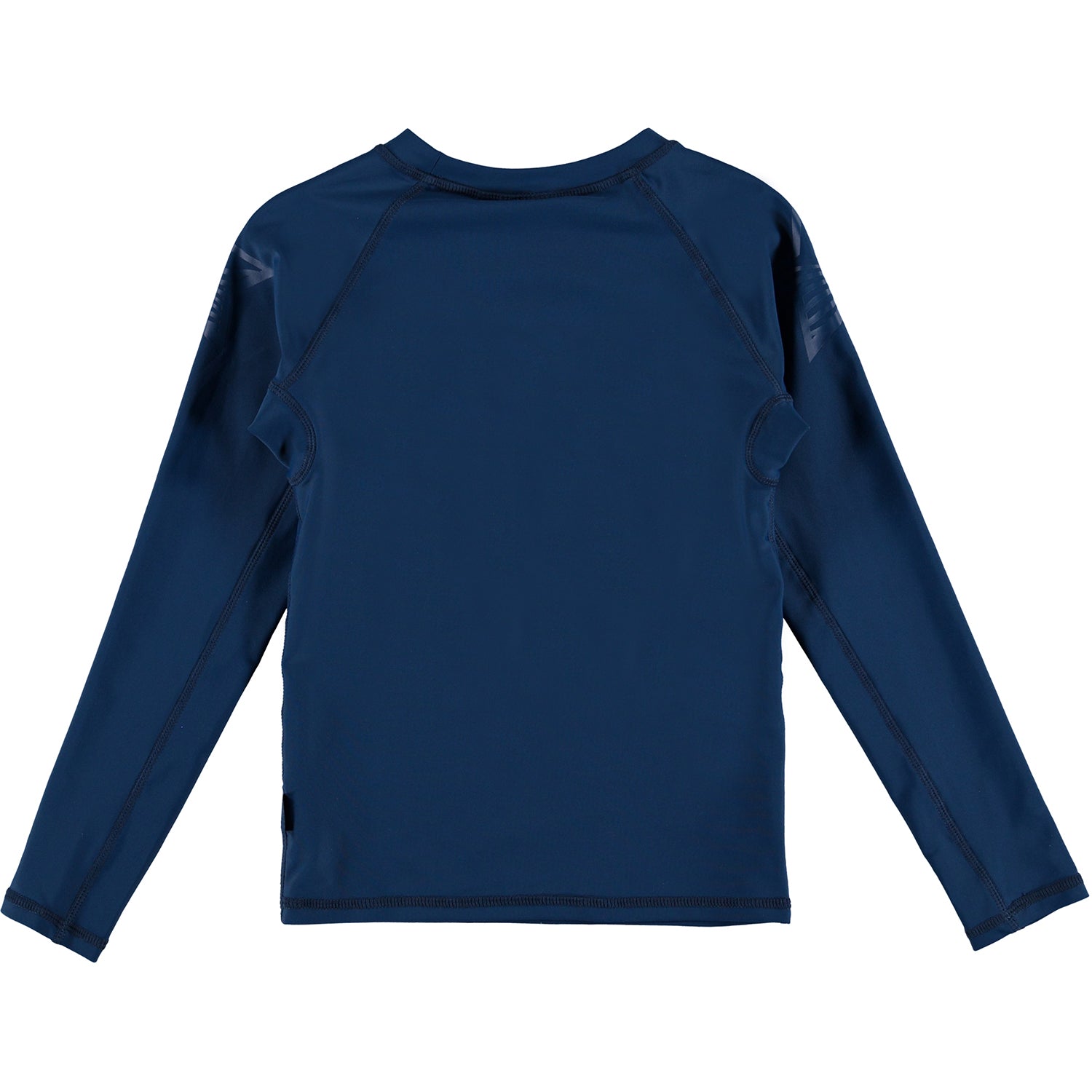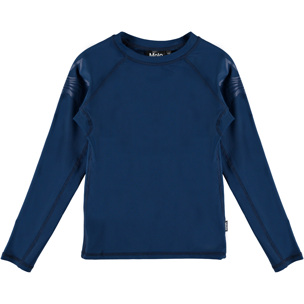 Dark blue, long sleeve rashguard that protects against the sun's harmful rays with +50 UV protection that all Molo's swimwear has. It is comfortable and lightweight to ensure easy movement. Wear it with trunks for a cool beach look.