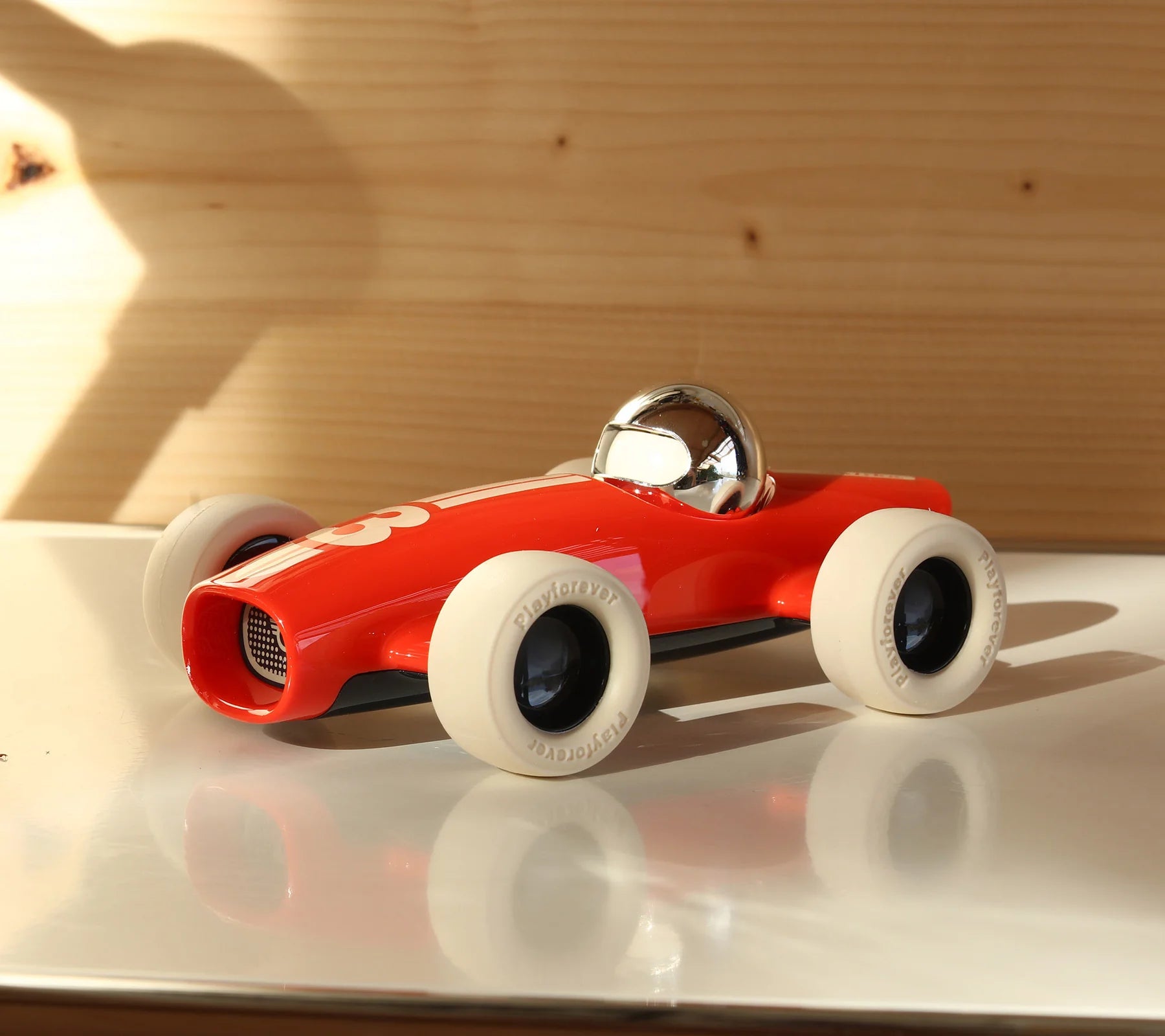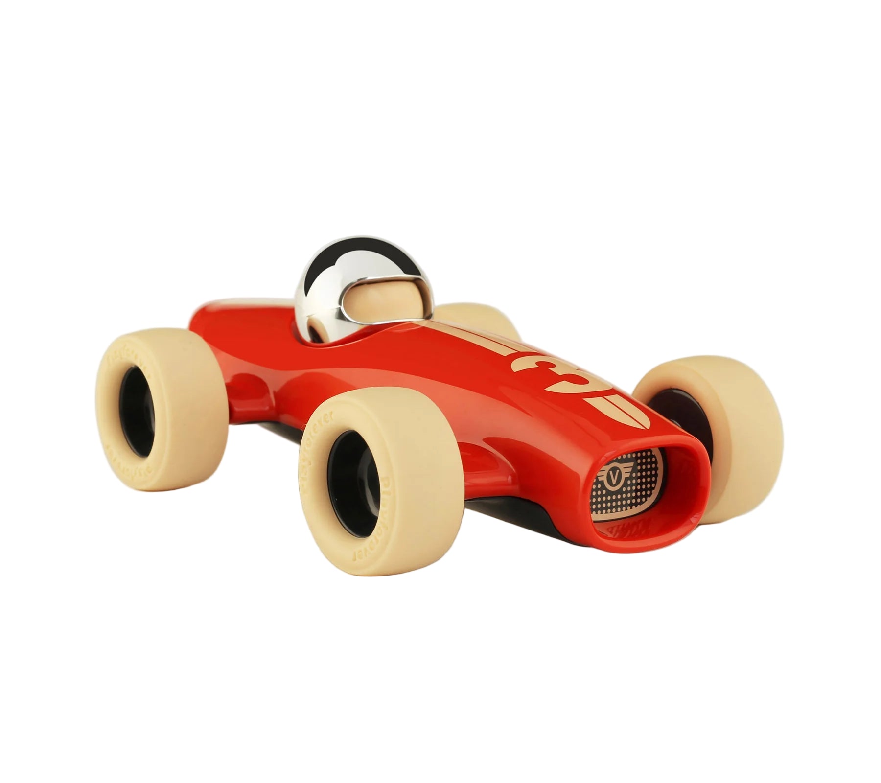 The Verve Malibu Dark Orange by Playforever channels the spirit of early Grand Prix racers with a sleek “cigar-tube” chassis, long nose and wide profile that’s beautifully re-imagined for modern play. Crafted from premium ABS plastic with a high-gloss UV-resistant finish and soft-roll rubber tires, it’s built to look elegant on a shelf and to roll smoothly across the playroom floor.
